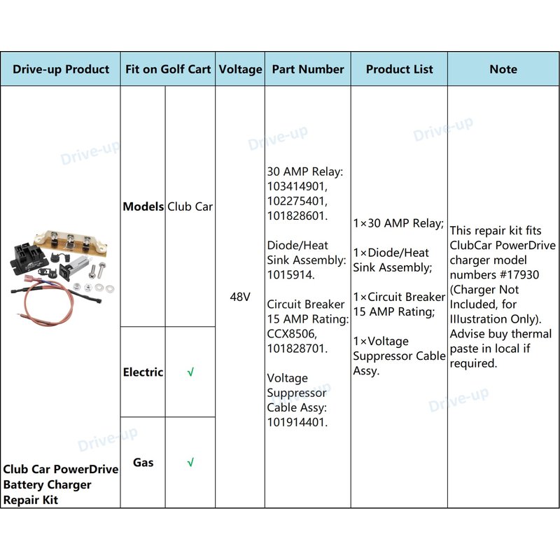 - This repair kit fits ClubCar PowerDrive charger model numbers #17930 (Charger Not Included,for IIIustration Only). Advise buy thermal paste in local if required.