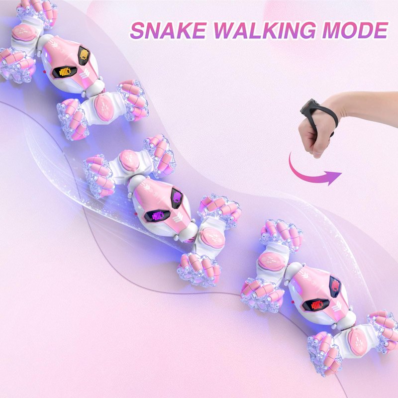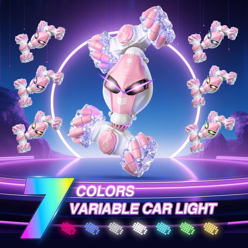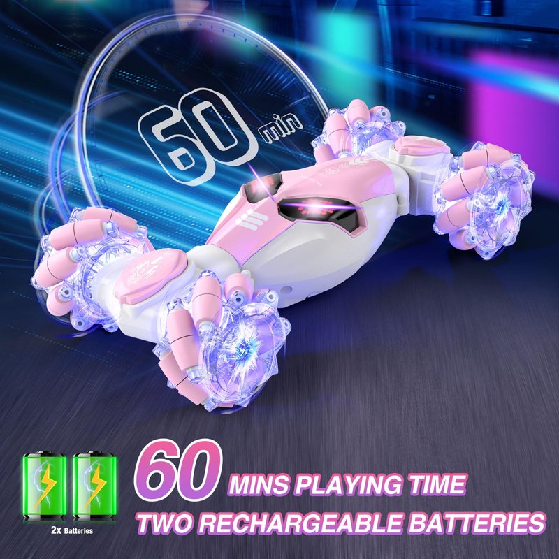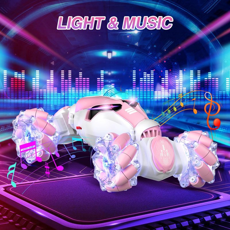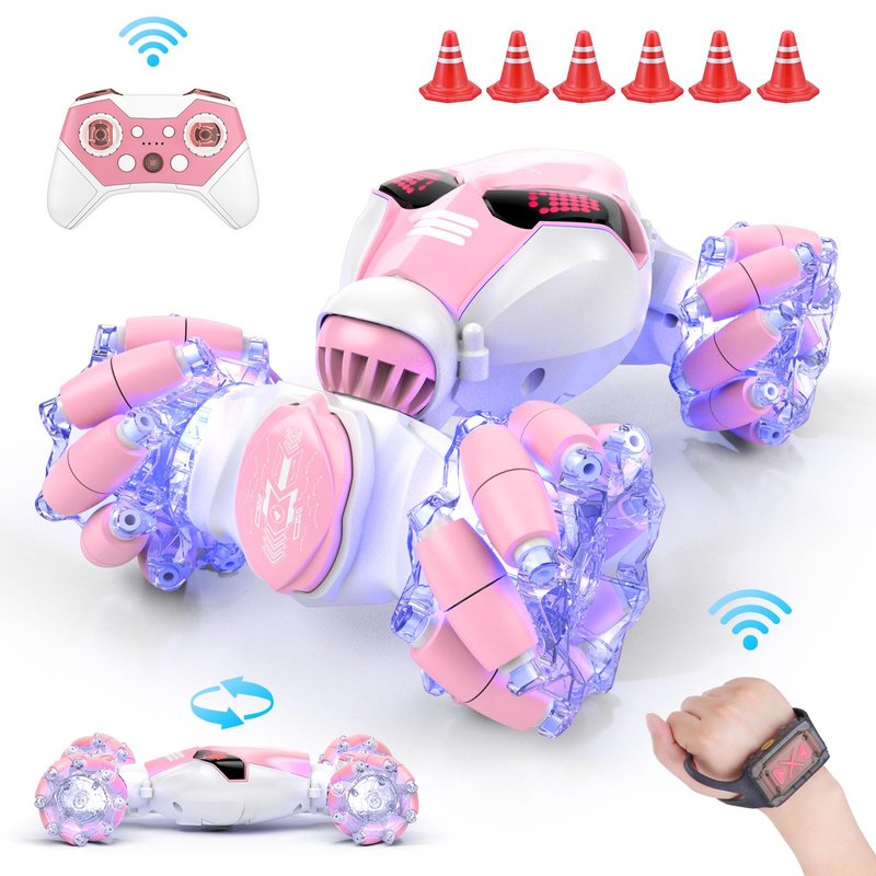 Powerextra Gesture Sensing Rc Stunt Car with Light & Music for Girls, 4WD Hand Controlled Double Sided 360° Flips Off Road Transform Remote Control Car with LED Light, Toy Gift for Age 8+ Kids, Pink