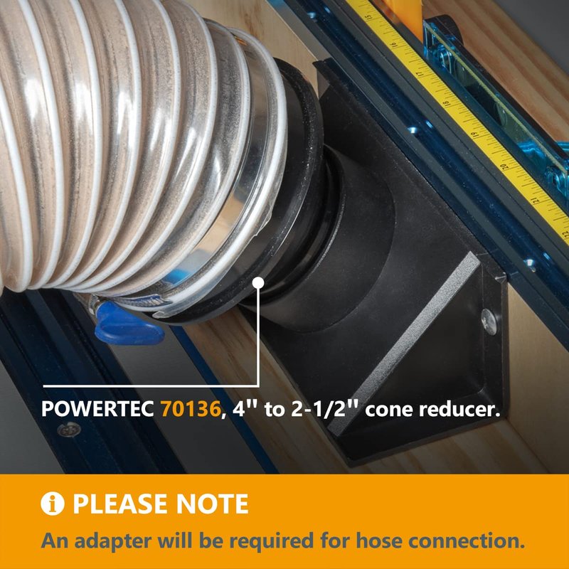 - PLEASE NOTE: This dust port has a 2-1/2” ID opening. To attach to a 2-1/2” ID hose, an adapter like POWERTEC 70182, 45 degree elbow, or POWERTEC 70178, 90 degree elbow will be required.