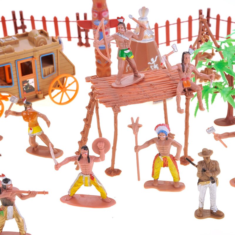 - BUNDLE : 58 Pieces deluxe play set. Wild west theme'd action figurines and props. Comes with horses, wagons, tee-pee's, canoe, trees, cowboys, and native american figurines, and much more! Figurines stand about 2.5 inches tall.