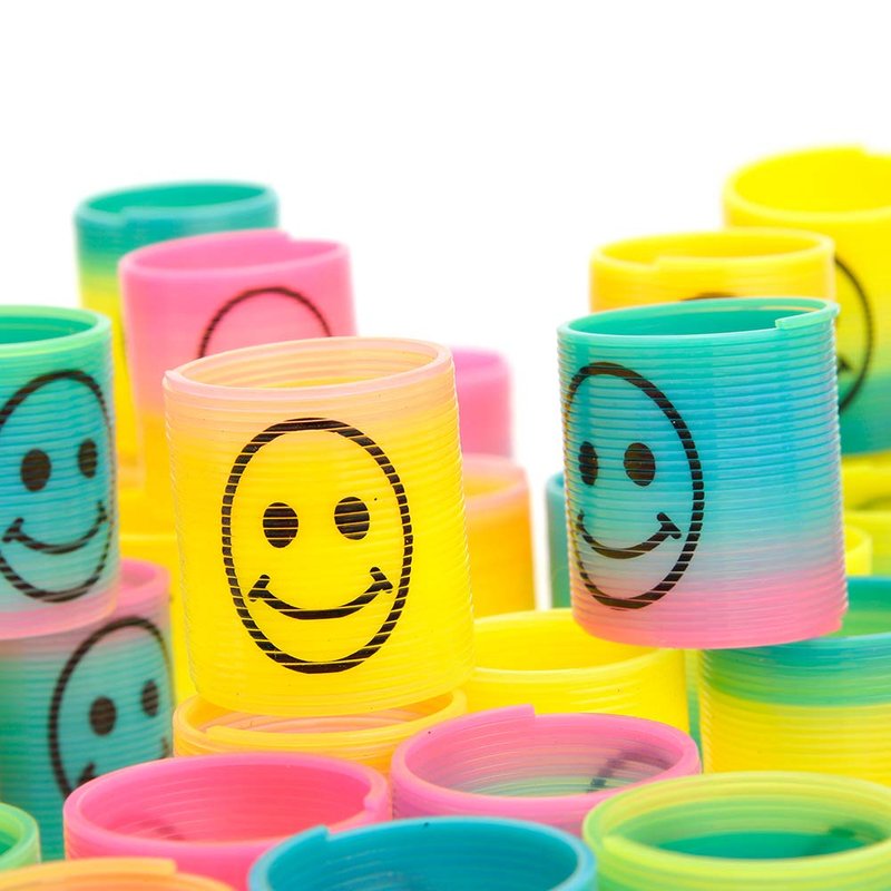 Bucket of mini emoticons coil spring toys. Great for parties, birthdays, or gifts. Bucket comes with 72 mini plastic rainbow springs with a smile emoji on it. Made out of durable waterproof material, watch them stretch, swing, and bounce.