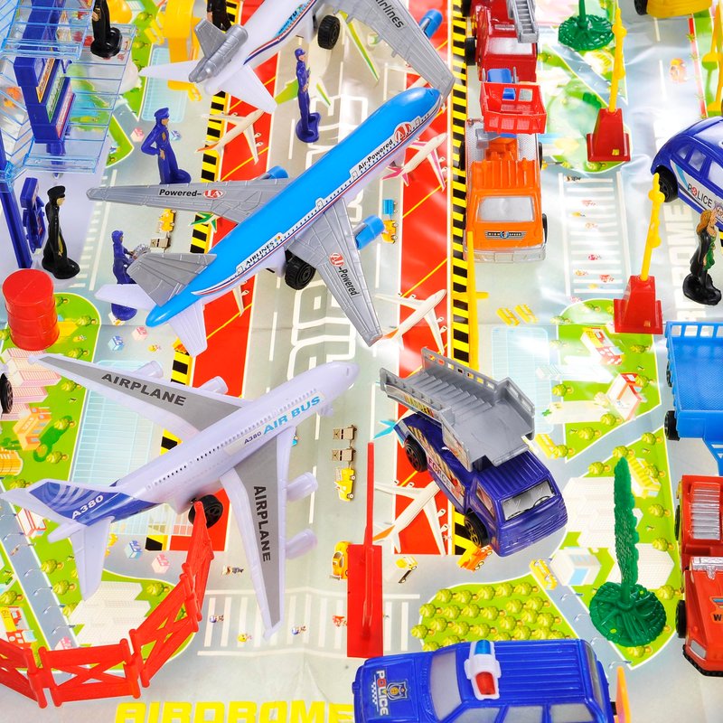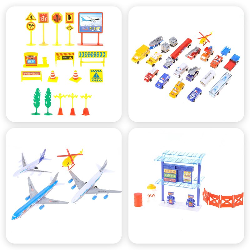 - 57 Airport Playset Piece: More fun ways to play and a variety of ways to play. Experience the full playset with different vehicles such as luggage transporters, emergency vehicles, buses and the astounding airplane. Go above and beyond with decorative accessories such as emergency cones, oil barrels and trees to make the fun time with this amazing playset more authentic.