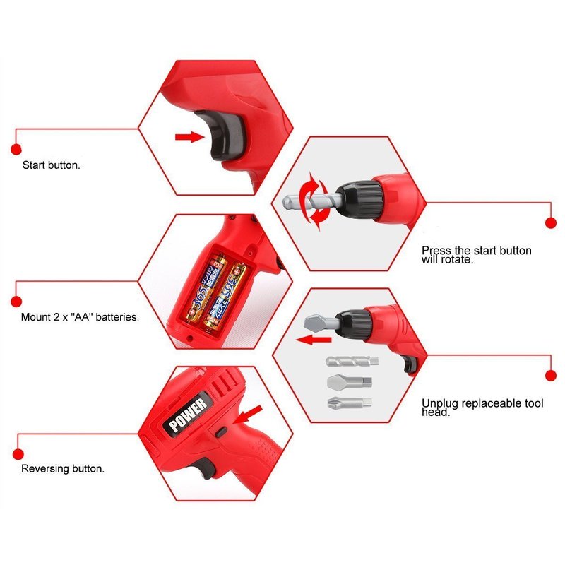 - Hand-Eye Coordination | Operating the toy drill and inserting the interchangeable drill bits into the chuck helps improve children's hand-eye coordination and fine motor skills.