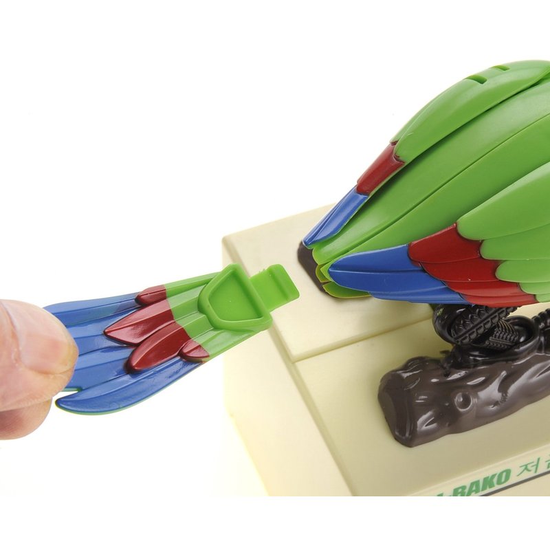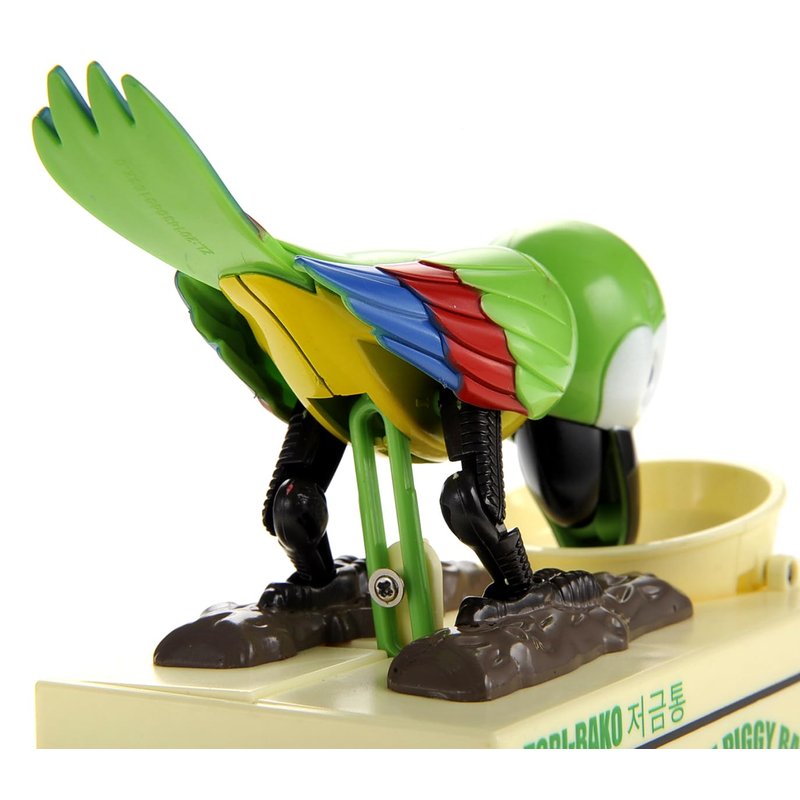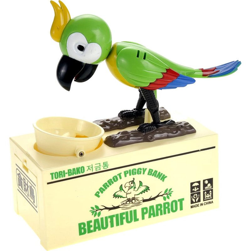 Give a coin to the adorable parrot and watch it gobble it away from you. This adorable bird coin bank is happy to save your coins in his savings box! The consumed coins are stored in the savings box -- what a fun way to save! (Powered by 2 x AA batteries -- not included).
