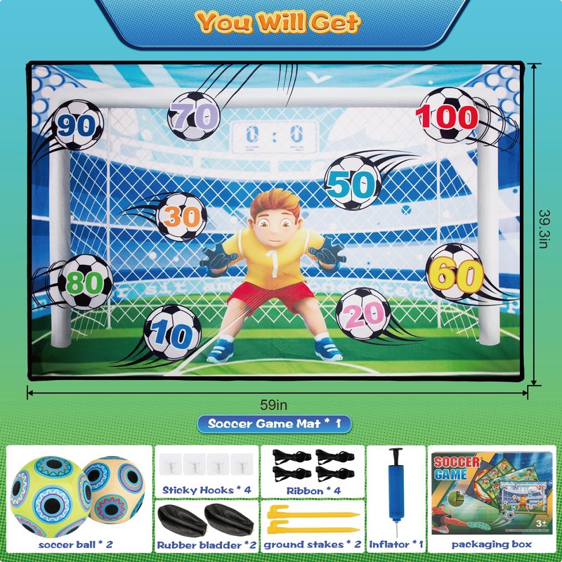 Our Soccer training set include: a folding soft game mat, 2 sticky Velcro soccer balls cover, 2 rubber soccer ball, 4 sticky hooks, 4 ribbons and 2 ground stakes.