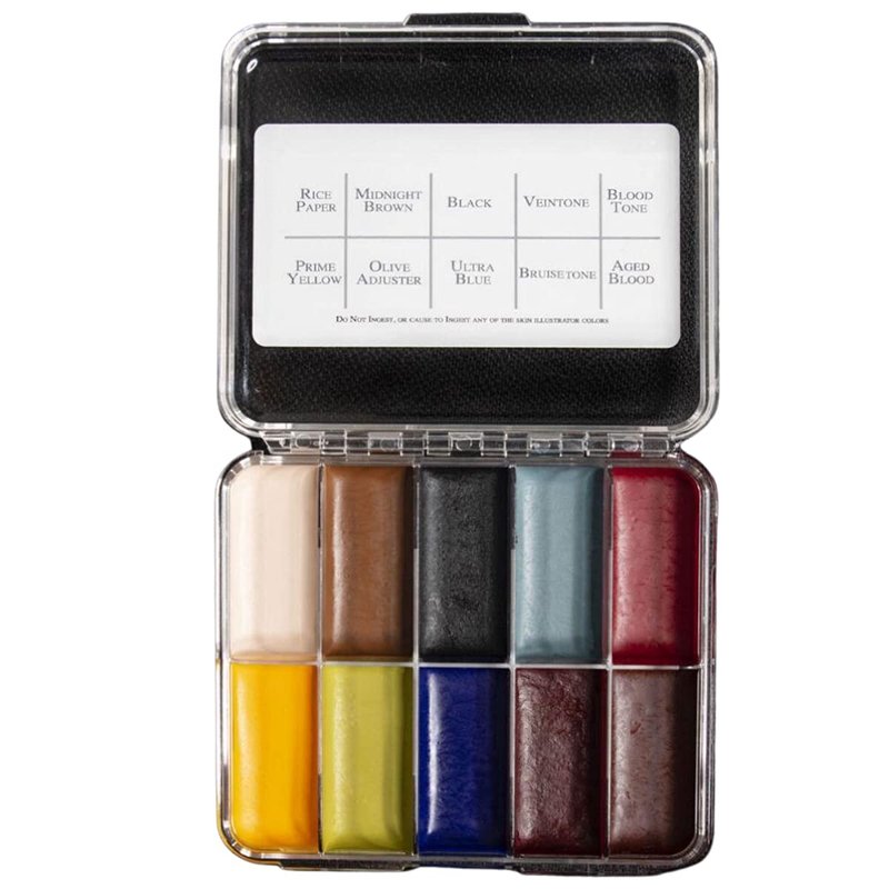 The Skin Illustrator On Set Zombie Palette is a compact version of the full size palette, which was custom ordered by 2 time Oscar winner David LeRoy Anderson. It was used on the movie, "Dawn of The Dead". David said the Zombie Palette's color combination was just what he needed to color the dead. One of his favorite aspects of the palette is the, "...Awesome label - I love the tie!" You must use Skin Illustrator Activator, Skin Illustrator Slow Activator, or 99% alcohol to activate the color pigment. Do Not use 70% alcohol, MEK, acetone, water or any other solvent. Removal is easy with Telesis Super Solv orTelesis Makeup Remover.
