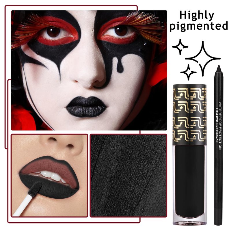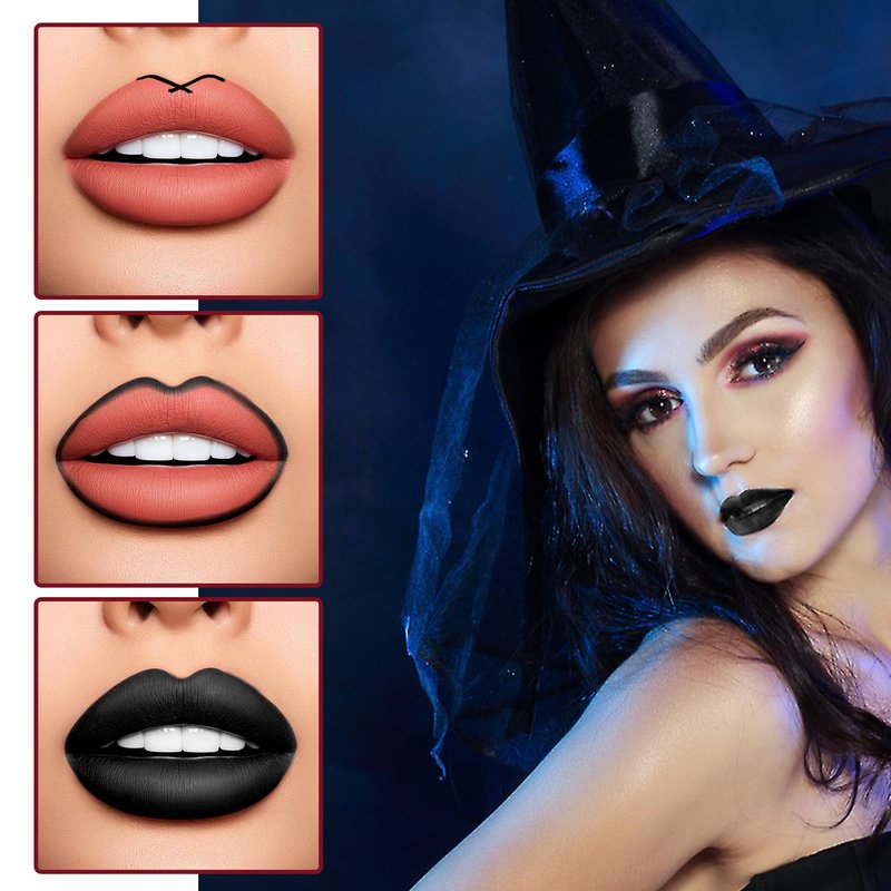 Black matte liquid lipstick and lip liner is very easy to apply and not easy to fall out, its unique waterproof formula can keep your lip makeup delicate and intact for you even after sweating or dining, the bold and unique black tone is perfect for Halloween, Carnival, Cosplay, Parties and Gatherings.