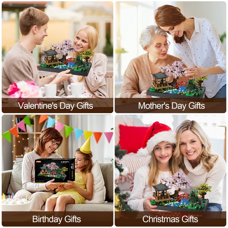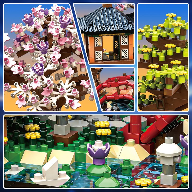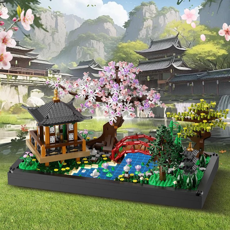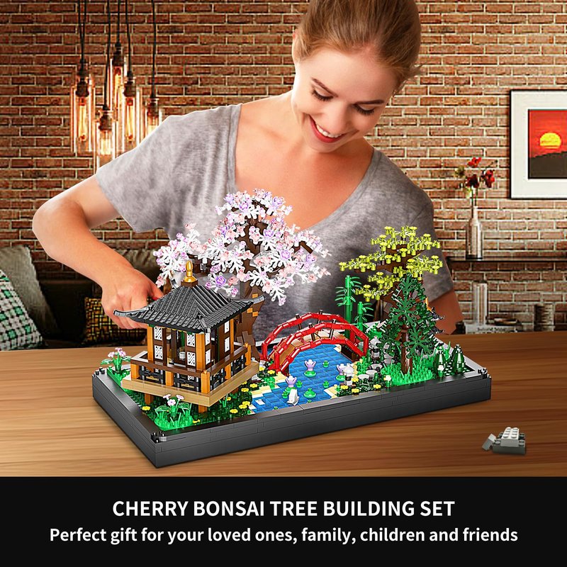 - 【UNIQUE JAPANESE ARCHITECTURE】The cherry blossom bonsai tree building block set adopts the ancient Japanese house architecture,The cherry blossom trees symbolize the brevity and beauty of life,The exquisite design of the pavilion and arch bridge adds a sense of hierarchy to the whole,The lotus dotted in the pond symbolizes purity and harmony,The combination of trees and flowers makes the whole scene more colorful,The lanterns add a warm glow to the night
