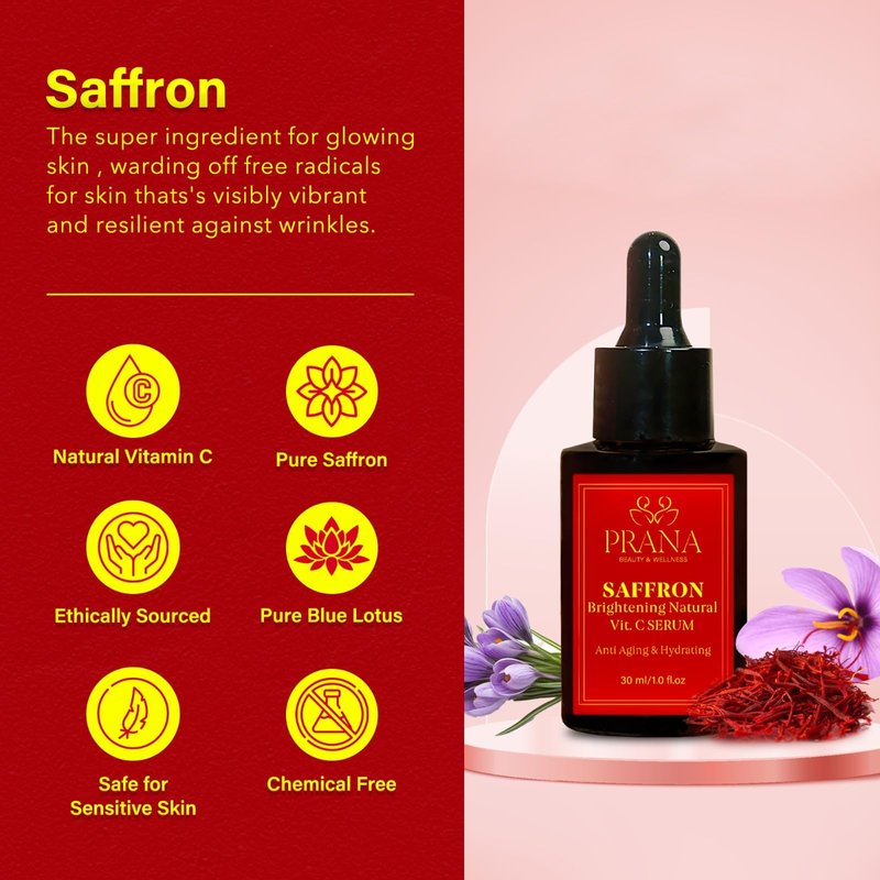 - Prana's Saffron Brightening Serum is authentically crafted, featuring a blend of natural oils and carefully selected herbs for promoting healthy and youthful-looking skin. This serum offers a holistic approach to skincare, incorporating traditional wisdom and natural ingredients to rejuvenate and harmonize the complexion.