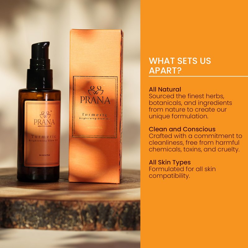 Experience the holistic benefits of PRANA Turmeric Brightening skincare oil for a rejuvenated, glowing complexion and deeply nourished skin.