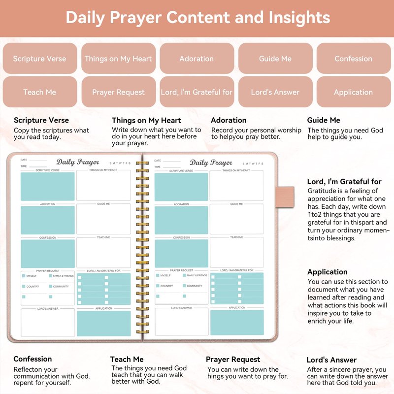 - HIGH-QUALITY MODERN DESIGN-The notebook is attached inner pocket and pen loop. Twin-wire spiral binding, classic and stylish combinations of appearance. Premium thick paper, reduce ink bleeding, erasing fraying and shading issues. Provide you with a better writing experience. A prayer tracker with space to record your prayers, so you can see how God moves through your life throughout the year.