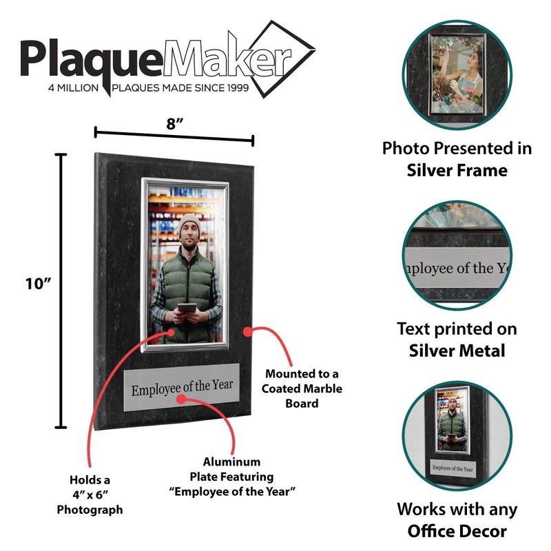 Show your employee's just how much you appreciate the good job they are doing by honoring an employee each year with their very own employee of the year plaque. Once received, insert their photo and proudly display this plaque for everyone to see. The elegant coated marble plaque is 10 x 8" and holds a 6 x 4" photo. The frame holding the photo will be silver.