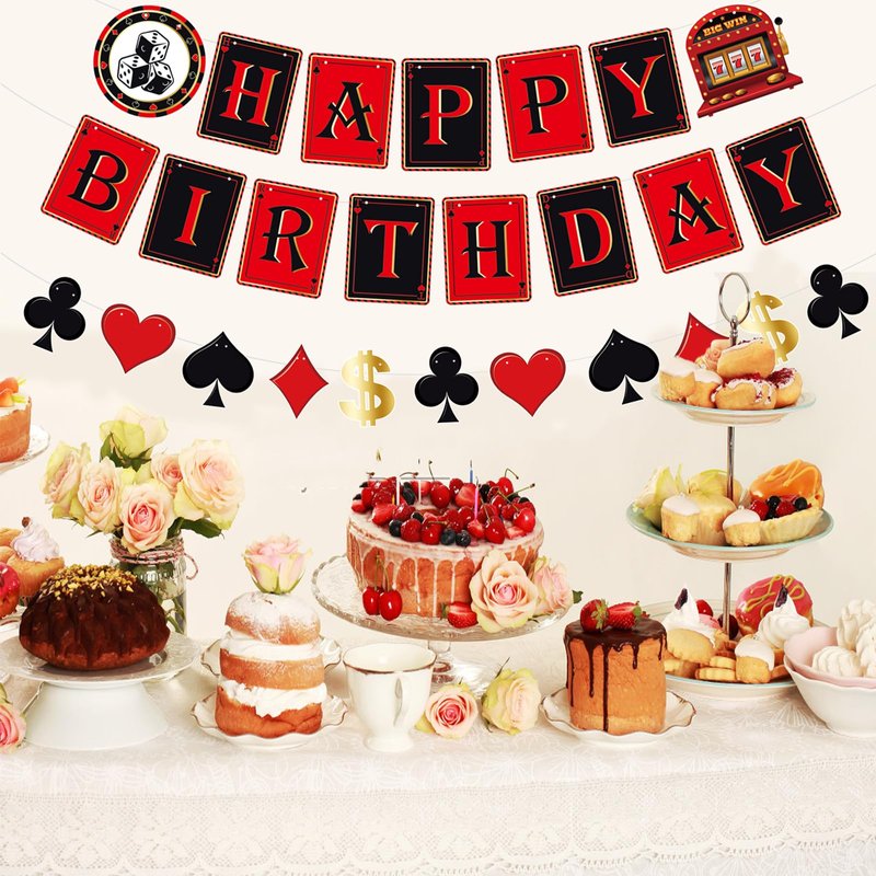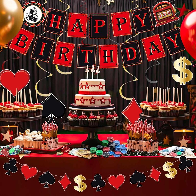 - Casino Birthday Party Decorations: All decorations use classic casino elements poker, dice, chips, four suits of poker, etc., paired with a happy birthday banner to perfectly highlight your party theme.