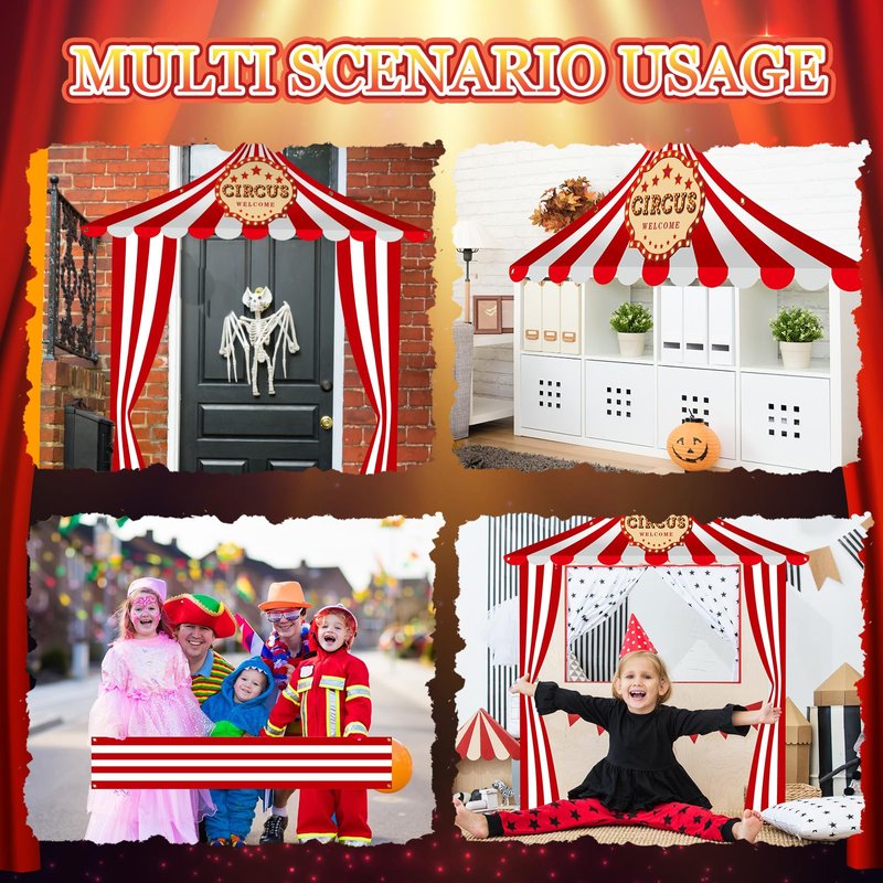 - Packing List: you will receive 1 piece of circus awning decoration with circus printed sign pattern, 2 pieces of red and white striped carnival banner with a length of about 72 inches, with 1 roll of double sided adhesive for easy hanging and easy pasting