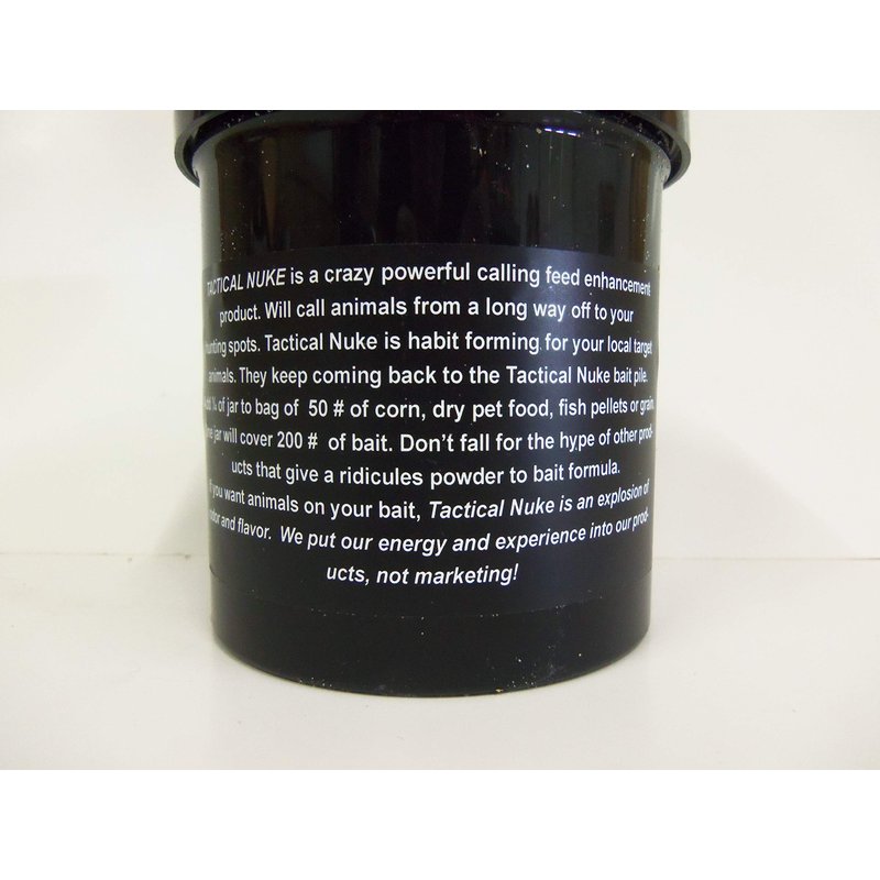 Deer calling feed enchancement. Tactical Nuke is a craxy powerful calling feed enhancement product. Will call animals from a long way off to your hunting spots. Tactical Nuke is habit forming for your local target animals. They keep coming back to the Tactical Nuke bait pile. Add 1/4 of jar to bag of 50lbs of corn, dry pet food, fish pellets or grain. One jar will cover 200lbs of bait. Don't fall for the hype of other procts that give a ridicules powder to bait fromula. If you want animals on your bait, Tactical Nuke is an explosion of odor and flavor. 16 oz