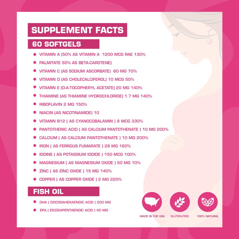 - Essential Ingredients for baby & mom support: Folic acid, Omega 3 DHA/EPA, Vitamins A, B6, B12, C, D3, E & Minerals: Calcium, Iron, Zinc, Magnesium *