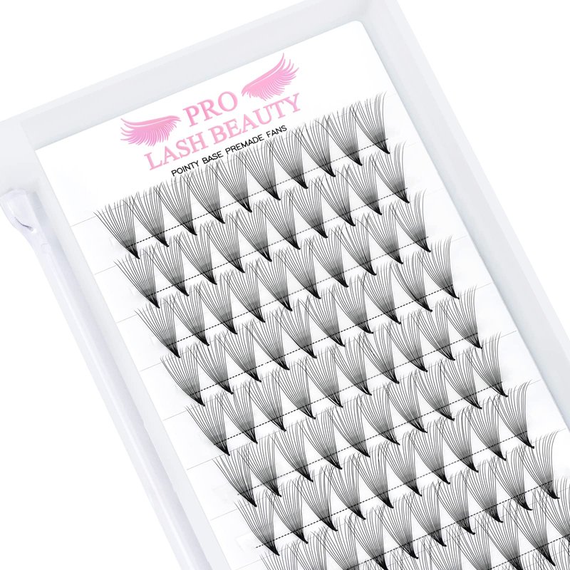 - Specification : Pointy Base Premade Fans Eyelash Extensions have regular and large trays that per regular tray has 120 fans and per large tray has 320 fans . Available in 3-14D , 0.05/0.07/0.10 , C and D curl , 9 to 16 mm single length and 9-16 mix length .
