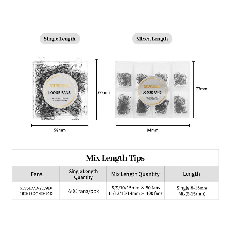 - Specifications:XIUSUZAKI offer premade lashes and 600 fans loose fan(Quantity +-2%). Mega volume & dramatic effect, feel free to choose any style you like. 5D 6D 7D 8D 9D 10D 12D 14D 16D 20D, 0.03/0.05/0.07mm thickness, C/D curl, 8-15mm length.