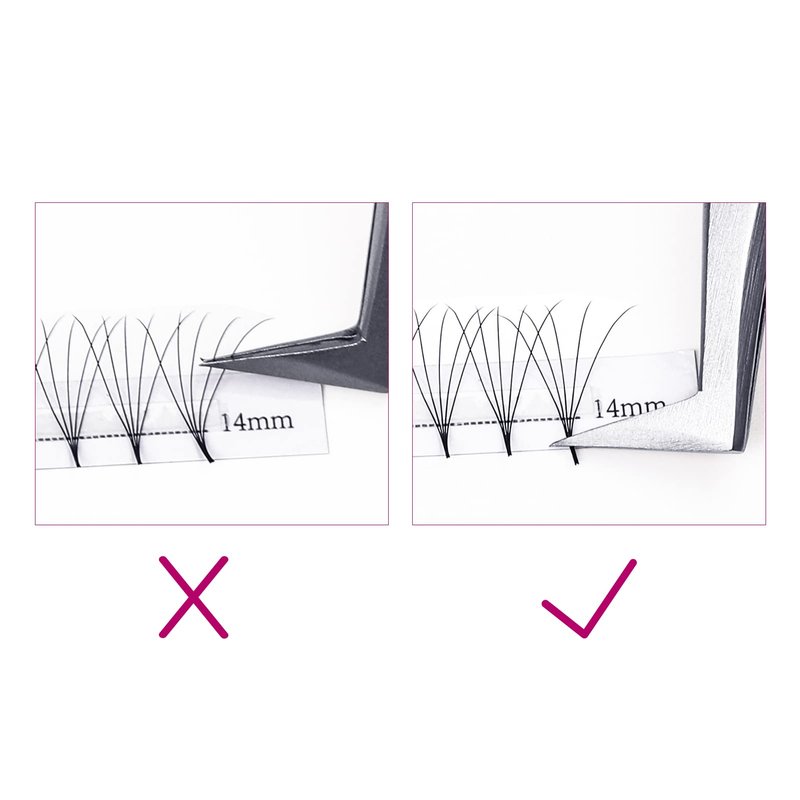 1. The tip of the tweezer should keep level with the lash strip, grab the bottom part from the fan's root then pull them up.