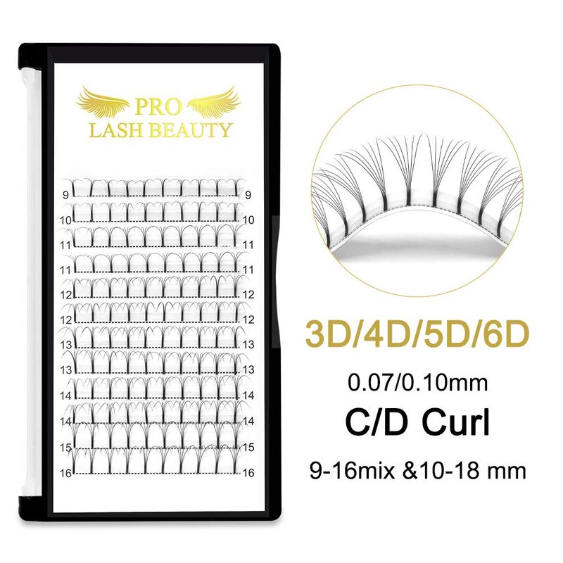 - Durable : Premade Fans Eyelash Extensions have 120 fans one tray . Available in 3D 4D 5D 6D , 0.07/0.10 , C and D curl , 9 to 20 mm length. Premade Volume Eyelash Extensions are black PBT (PolyButylene Terephthalate) material which are durable and can stand high temperatures . They are very soft and lightweight.