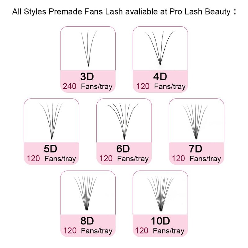 - PROLASH Premade Fans Eyelash Extensions : Short Stem in 3D 4D 5D 6D 7D 8D, with C / D curl in 0.07 / 0.10. We have 9 mm to 20 mm single length and 9-15 mixed length tray. If you need 4D single length, please choose ASIN: B08C9RJRRS.