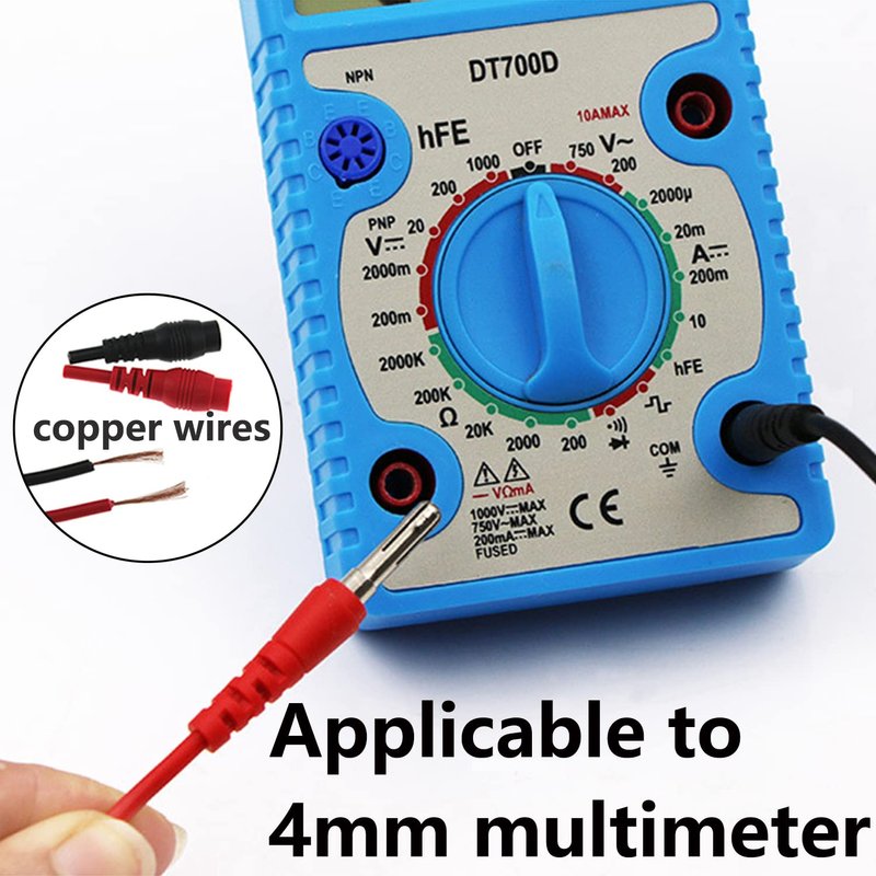 - Digital Multimeter Test Probe & Testing Leads Set -- The inner core of the banana plugs for multifuncational multimeter test leads set is composed of oxygen-free copper wire, which makes the electrical test leads set have high strength, high conductivity, bending resistance, low resistance and long service life. Both ends of the testing leads are threaded sockets, which can be used flexibly with accessories. The jumper wires cable is connected with the multimeter test probes.