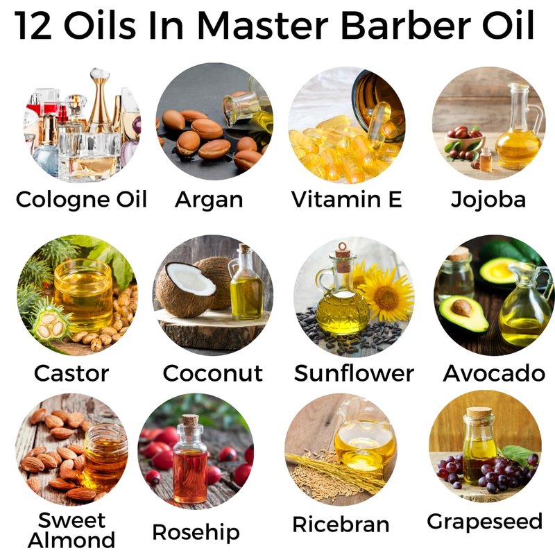 - Master Barber Oil, anti-aging, cologne, beard care, haircare, skincare, argan oil, rice bran, sunflower, almond, rosehips, avocado, MCT, jojoba, vitamin E, castor, grape seed, fragrance, moisturize, nourish, revitalize, hydrate, soften, brighten