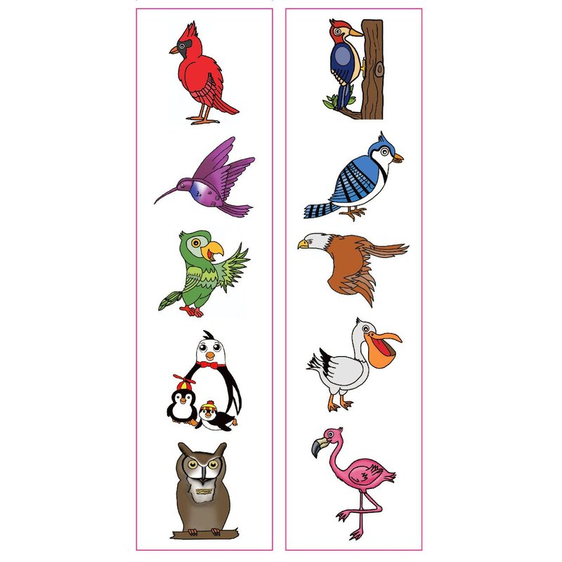One order = 6 sheets (3 of each style.) There are 10 different bird tattoos: hummingbird, cardinal, bluejay, owl, pelican, parrot, flamingo, bald eagle, woodpecker. Each order will receive 30 total tattoos (6 sheets x 5 per sheet). Each tattoo is 1.5”-2” wide. Premium quality, rich colors last for days (depends on your skin). These are applied with water and are waterproof. Great for bird lovers!