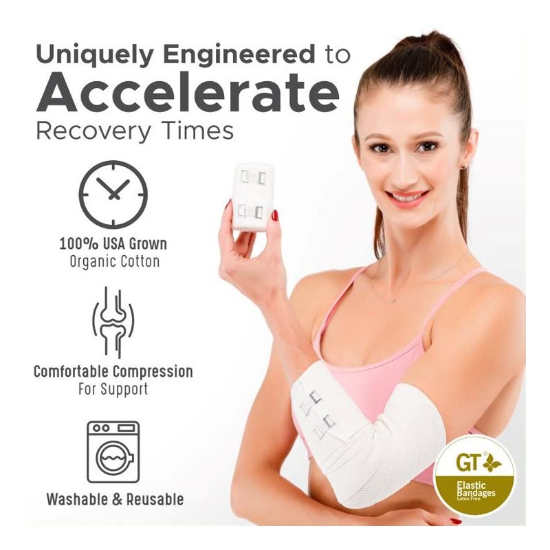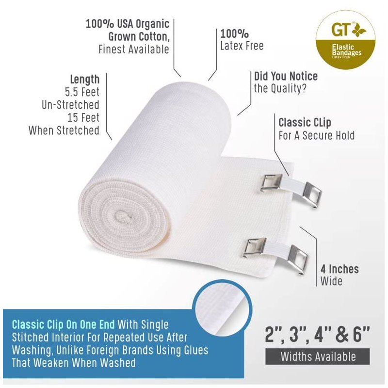 Premium LIFETIME guaranteed American Cotton elastic bandage roll with classic clip closures from GT. Use GT LIFETIME American Cotton elastic bandage wraps to provide support when even compression is required. Our ultra-comfortable elastic bandages are made of latex free material to avoid any allergic reaction. The odor resistant fabric allows for extended use even during high intensity activities. We recommend these wraps as an addition to your household first aid kit medical supplies or for sports and athletic therapy. Our engineered proprietary clips are made for variable strength and holding power. Whether you are recovering from surgery, a sports injury, or require compression for daily wear, you can rely on GT elastic bandages to support you. Our bandage wraps are also safe for veterinarian use with dogs, cats, and other animals.These custom fit compression wraps are ideal for prolonged wear and easy-to-use for wrapping an ankle, foot, thigh, knee, wrist, or other muscle or body part. Adjust the wrap to your desired tightness for providing pain relief and stability to a sprain, strain, or to promote circulation and reduce swelling. High quality GT LIFETIME bandages are washable and reusable for a lifetime of use (wash on cool, in laundry bag and hang to dry)American Cotton high thread count with woven elastics13 - 15 Feet (Stretched)Latex FreeClassic Hospital WhiteVolleyball, Soccer, Football, Basketball team uniform compatibleEngineered clips with variable holding strengthAvailable in 2 Inch, 3 Inch, 4 Inch, and 6 Inch GT Soft Cotton Elastic Bandages