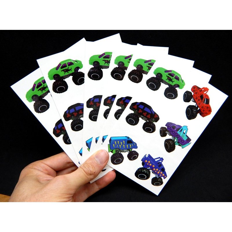 One order = 6 sheets featuring six different monster truck temporary tattoos. Each order will receive 36 total tattoos. Each tattoo is 1.5”-1.75.” Premium quality, rich colors last for days (depends on your skin). These are applied with water and are waterproof. Don't waste your money on small, poor quality tattoos that don't stick to your skin or only last an hour! Great for Monster Truck parties!