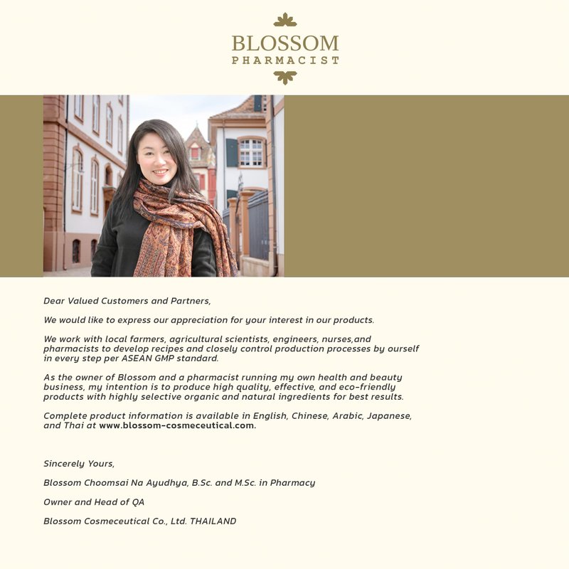 From the team of a nurse and pharmacists who manufacture the soap, we would like to thank you for trusting in the products of Blossom Cosmeceutical Co., Ltd. Thailand.