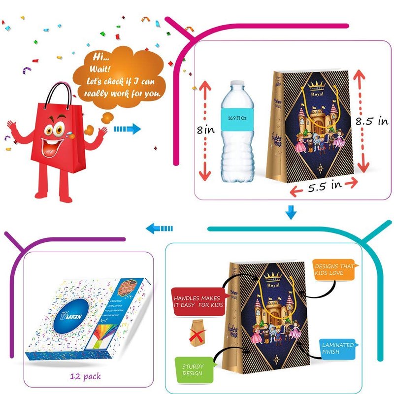 - Bag measures 8.5” tall, 5.5” wide. Each package includes 12 bags. Good size to hold all your party favors!