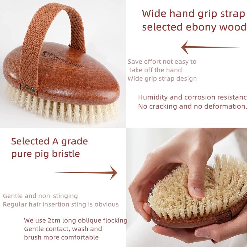 - 【Exciting quality🌟】 : Made from high standard real boar bristles and natural wood, this body brush provides a long-lasting skin scrubbing solution. The wooden handle is made of high hardness ebony wood with a solid texture for long lasting protection against cracking and warping. The bristles are made from selected pure boar bristles, gentle and sting-free, with new 2.3 cm beveled flocking, new large-hole flocking and new beveled perforations for extra body comfort.