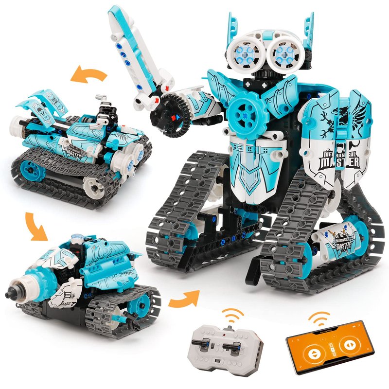 - 【Explore Robotics with 3 in 1 Building Set】398 pieces, kids will build a robot that holds weapon and a shield, also rebuild into a tank or a on-road motorboat. Then let it go forward, reverse, turn, omni-angle spin and show off indoor.