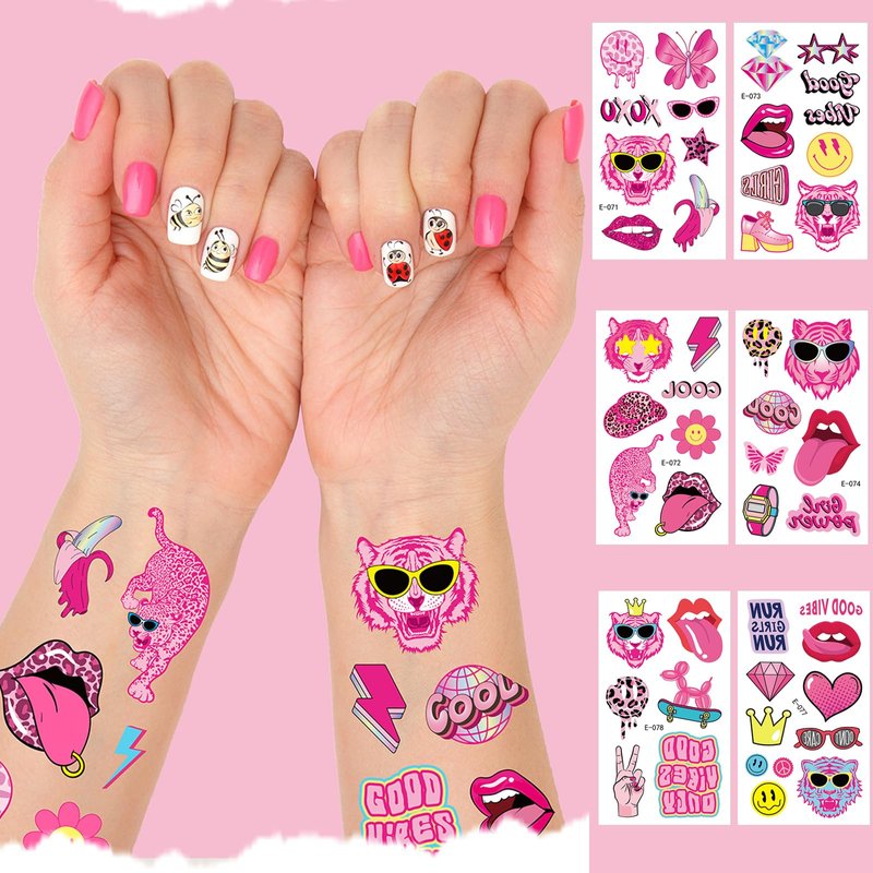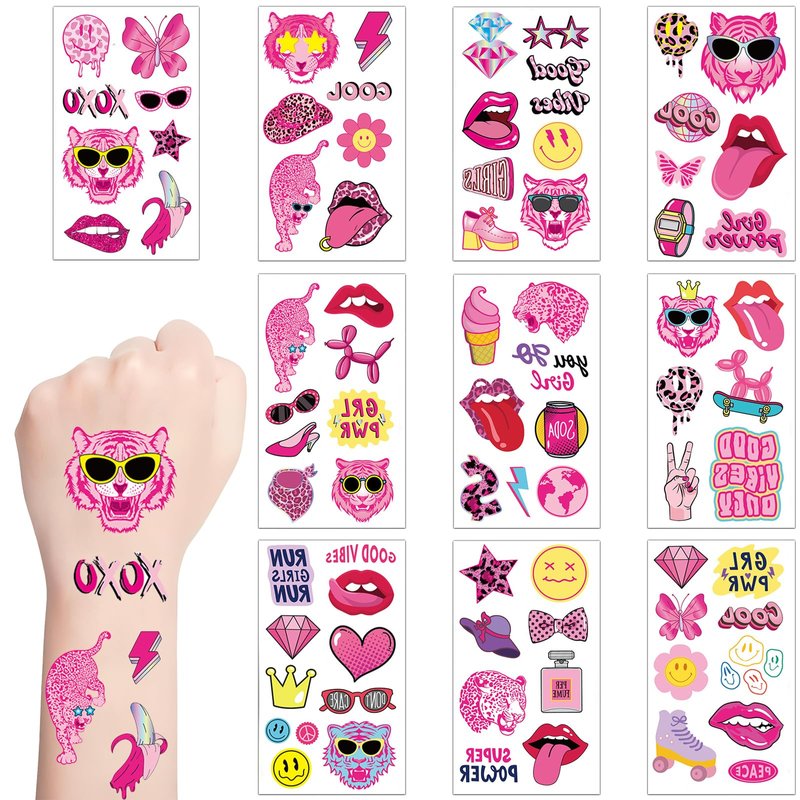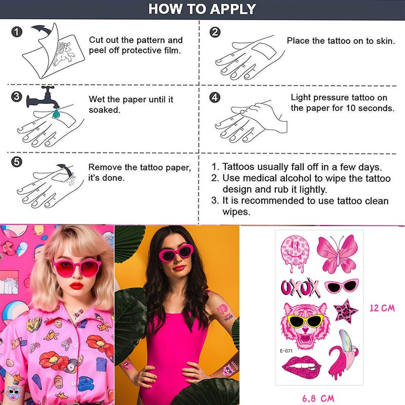 - Preppy Party Favors: the pink party tattoos measure about 6.9 x 12 cm/ 2.7 x 4.7 inches and can be attached to your arms, face, hands, neck, shoulders, lower back, legs, cup,mug and other stuff and so on.