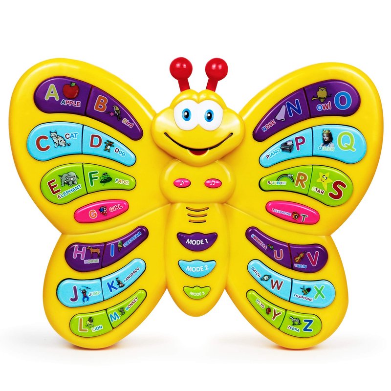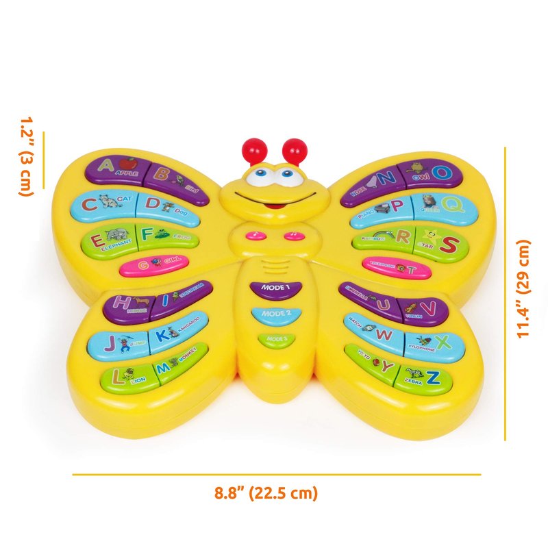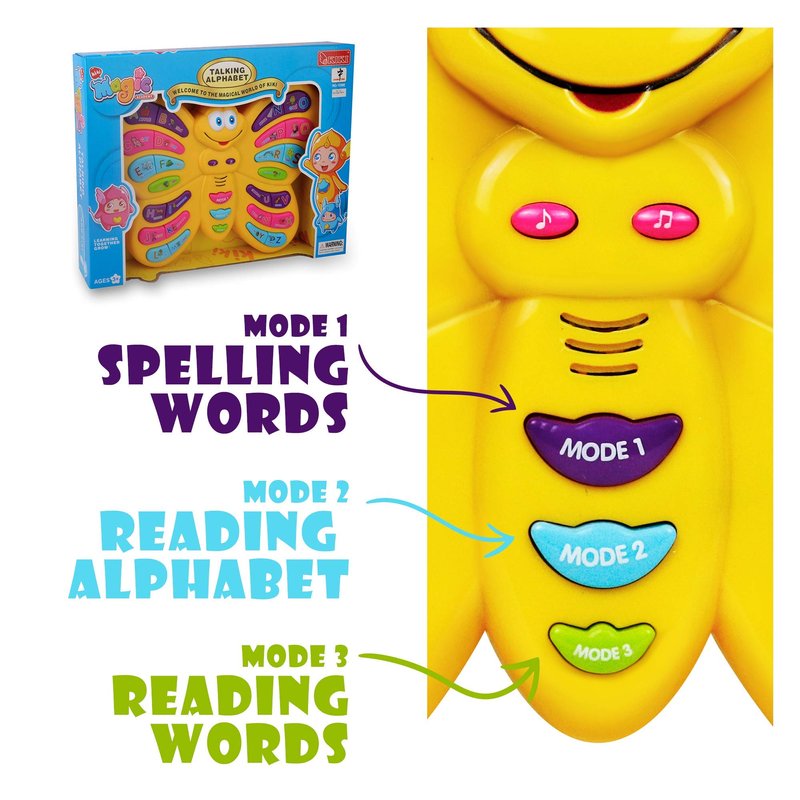 - 3 Leaning Modes – This ABC butterfly has 3 separate learning modes: spelling words, reading the alphabet; and reading words, as well as separate keys for songs. Kids can easily switch between modes using the 3 clearly marked buttons in the center.