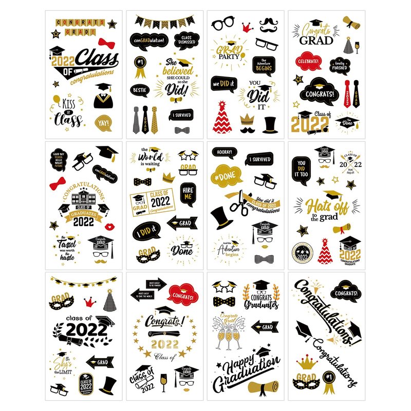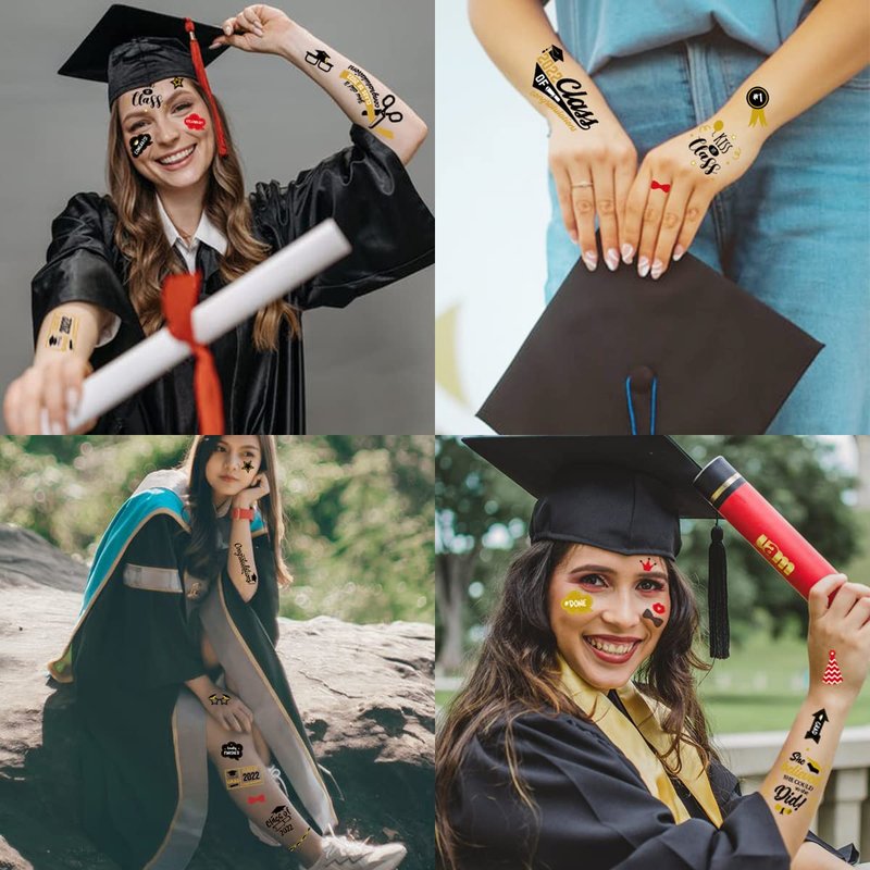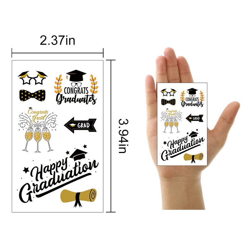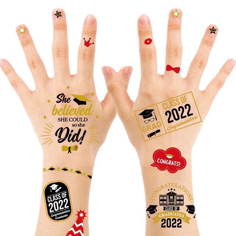 - 【Congrats grad! 】12 sheets Graduation temporary tattoos features 100+ handdrawn designs in gold, black, as graduation caps, stars, diplomas, you did it, Class of 2022, banner, cheering words and etc.