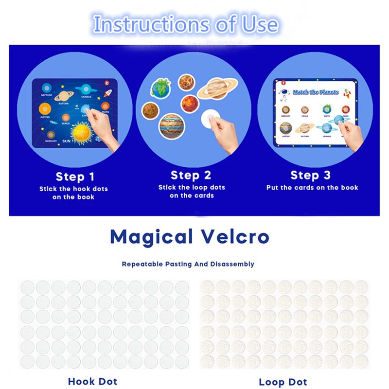 First Step!!! When you receive this busy book, parents are required to stick Velcro on the corresponding patterns and cards for their children. We are more willing to use this little toy to strengthen the communication and interaction between the child and the parent! Perfect Preschool Educational Toys for Kids Keeping the children busy and get a moment of silence for yourself when you need. So, this is great gift for our children,even for parents. Quality Velcro The Velcro is made of high-quality materials, sticking more firmly, and can be used repeatedly by your children, and there is plenty of Velcro. Specification: ☑Theme: Space ☑Material: High-quality white cardboard ☑Size: 11.42*8.86*1.1 inch ☑Weight: 0.415kg Package including: -1x Space Busy Book -1x Small Card -1x Velcro Warm Tips!!! 1.There might be a slight deviation of product dimensions due to manual measurement. 2.Contact us if you have any questions, we will reply you in time.
