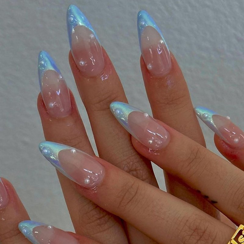 - Eye-catching Design: Beautiful almond french blue mermaid nails with pearl designs that will make you stand out in any occasion.