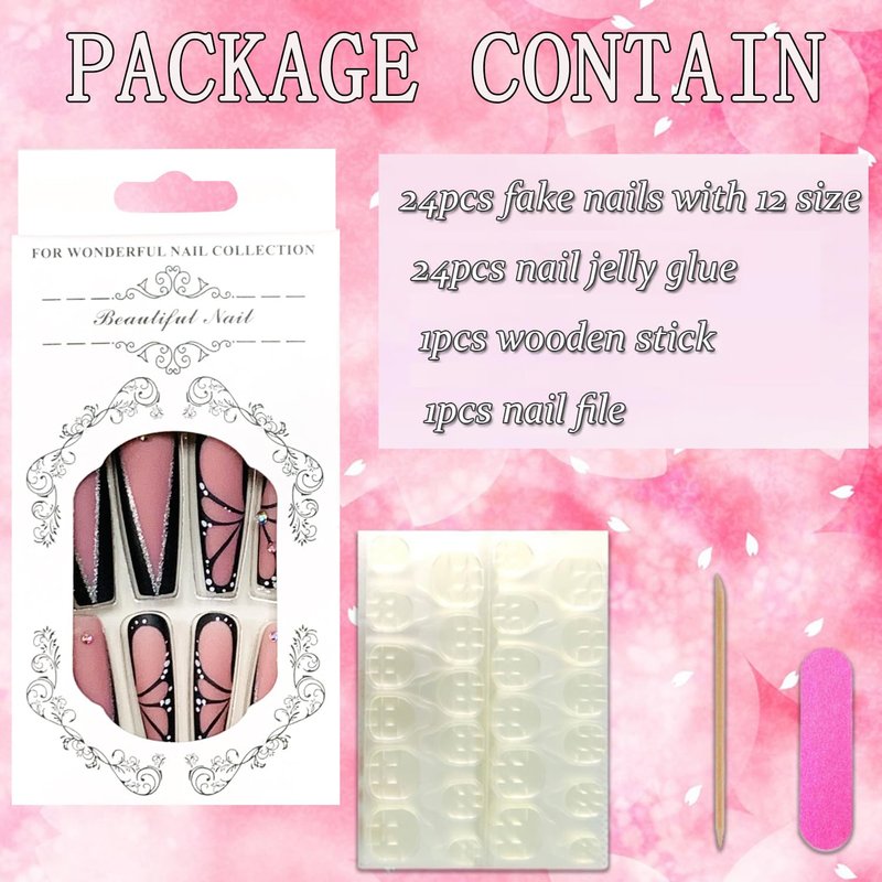 - 【False Nails Sets】You'll get 24 extra long coffin false nails in 12 sizes. 1 mini nail file, 1 small wooden stick, 1 piece of press on nails adhesive sticky tabs.