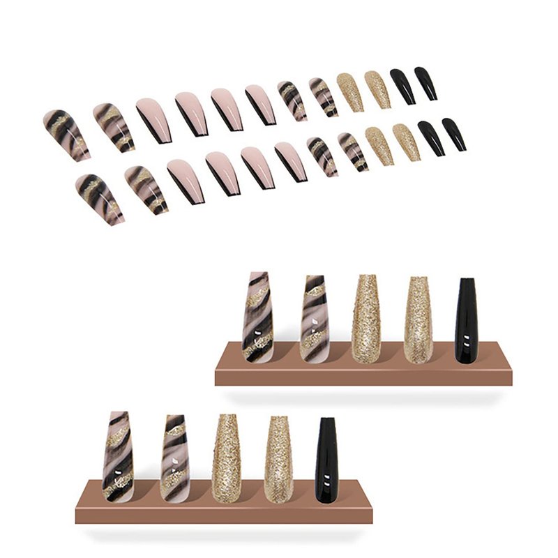 - 【Package Include】You'll get 24 pieces of extra long black with gold foil designs fake nails with delicate designs, you can choose the most suitable false nail for yourself, it is easy to trim and file them to in any length and shape you like.1 mini nail file, 1 small wooden stick, 1 piece of nail glue sticker and 1 piece cleaning paper. Glue on nails are perfect for most people's nails.