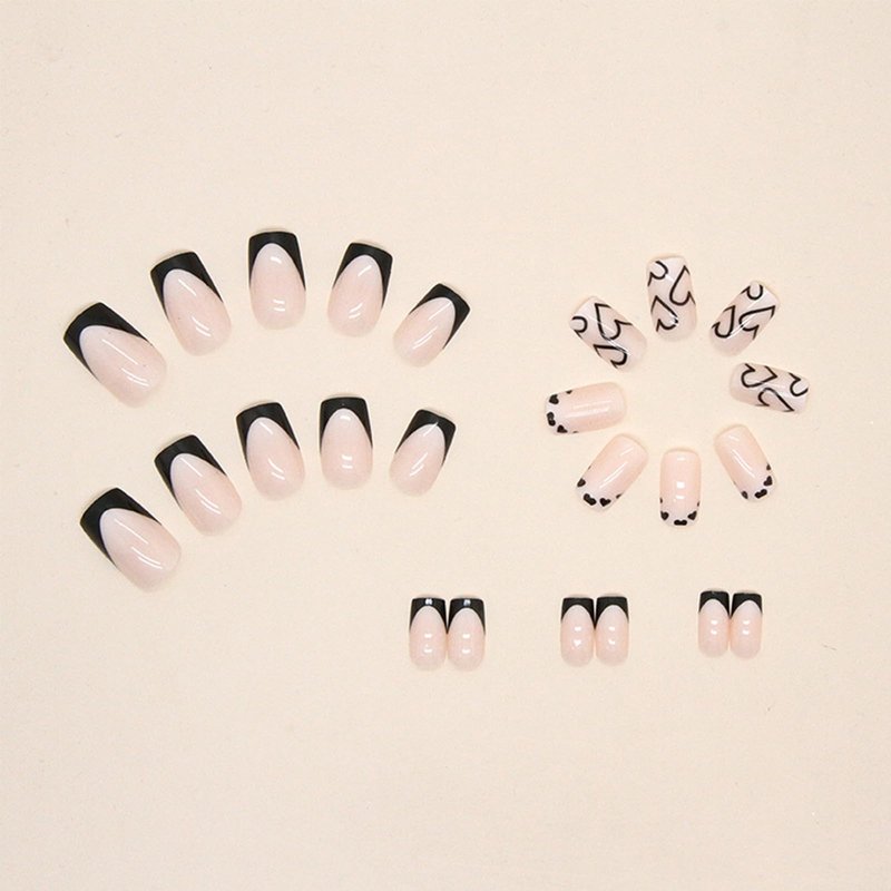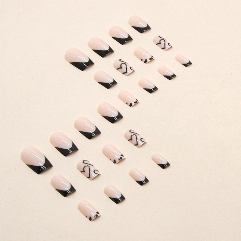 Press on Nails Medium Square Fake Nails Black French Tip False Nails with Designs Black Heart Full Cover Acrylic Stick on Nails Glossy Glue on Nails Reusable Nude Artificial Nails for Women 24pcs