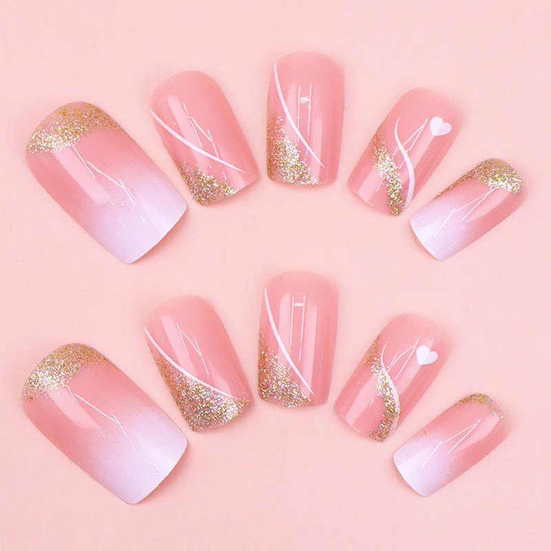 Press on Nails Medium Square Fake Nails Gold Glitter False Nails with Design Heart Curve Glue on Nails Gradient Pink Full Cover Acrylic Stick on Nails Reusable Artificial Nails for Women Manicure Kit