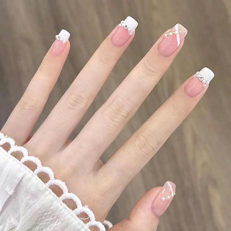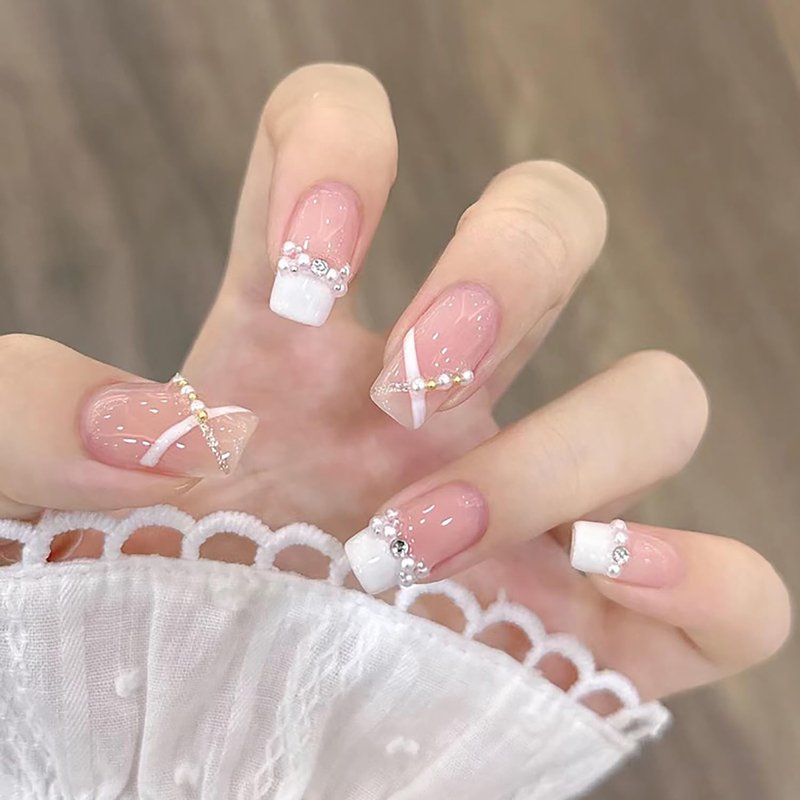 - Eye-catching Design: Beautiful french tips coffin nails with line patterns and pearl that will make you stand out in any occasion.