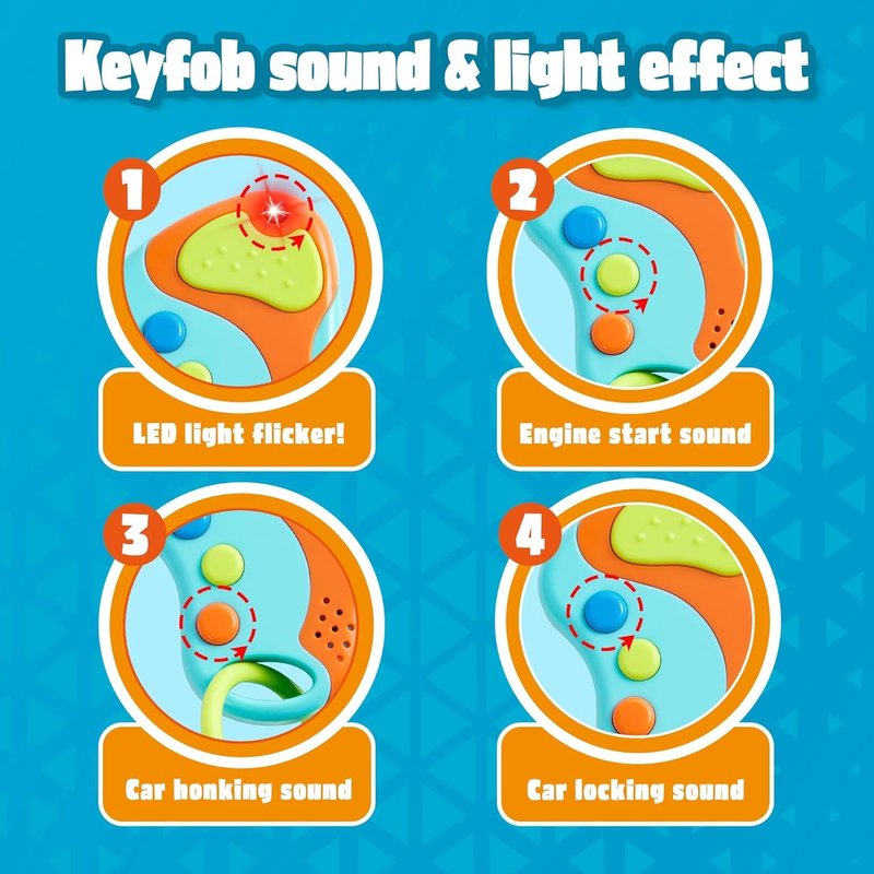 • Sound Effects: Toy Mobile Phone (Requires 3 AAA Batteries Not Included) Talks Back to Kids with14 Different Unique Phrases and Music When Touched. Electronic Toy Keyfob (Requires 3 L44 Batteries Included) Features Colorful Press Buttons with Three Different Car Sounds.