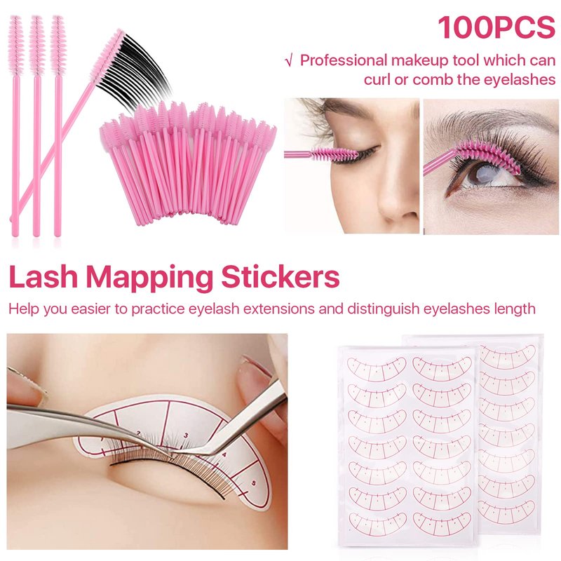 - False Eyelash Extension Kit: Mannequin head with removable eyes, 100 pcs smart glue rings, 1 large lash mirror, 100 pcs disposable micro swabs, 25 pcs mascara brushes wands, 10 pairs of under eye gel pads, 2 pcs Stainless steel eyelash extension tweezers, 3 pcs five-point practice isolation paper, 2 boxes of False Eyelashes.