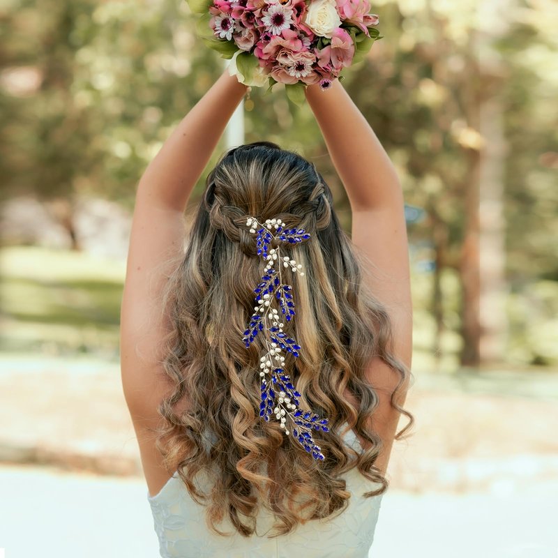 - 【Size】 Blue bridal hair vine piece is with size 13.4" x 2.2" (Length x Width), the length of the matching earring is approx. 2.4", free size for women and girls
