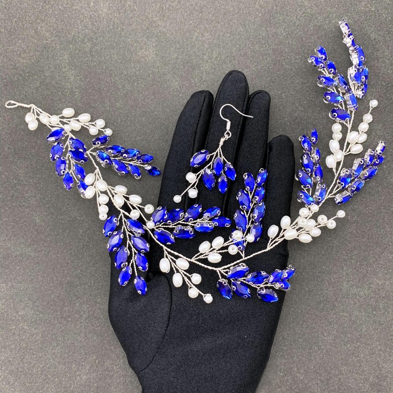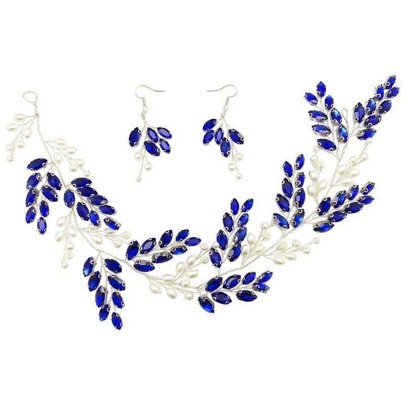 - 【Handmade Design】 The blue wedding crystal earring hair piece set is hand wired by silver color alloy vine with blue rhinestone & ivory pearls in glamorous and elegant design, shiny and add sparkle to your hairstyle, makes you standout in your big day