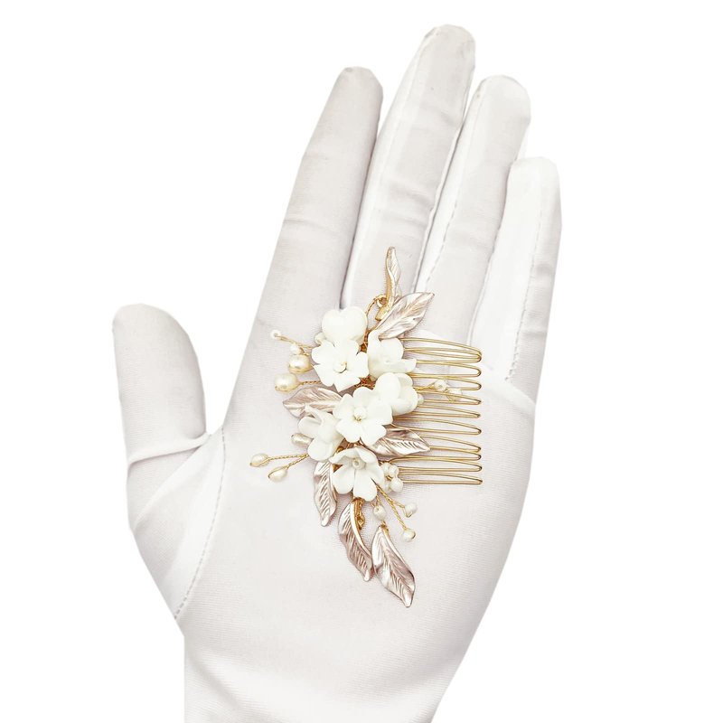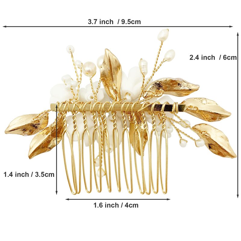- Material: High quality alloy vine & comb & leaves, ceramic flowers, beige faux pearls, tiny white beads