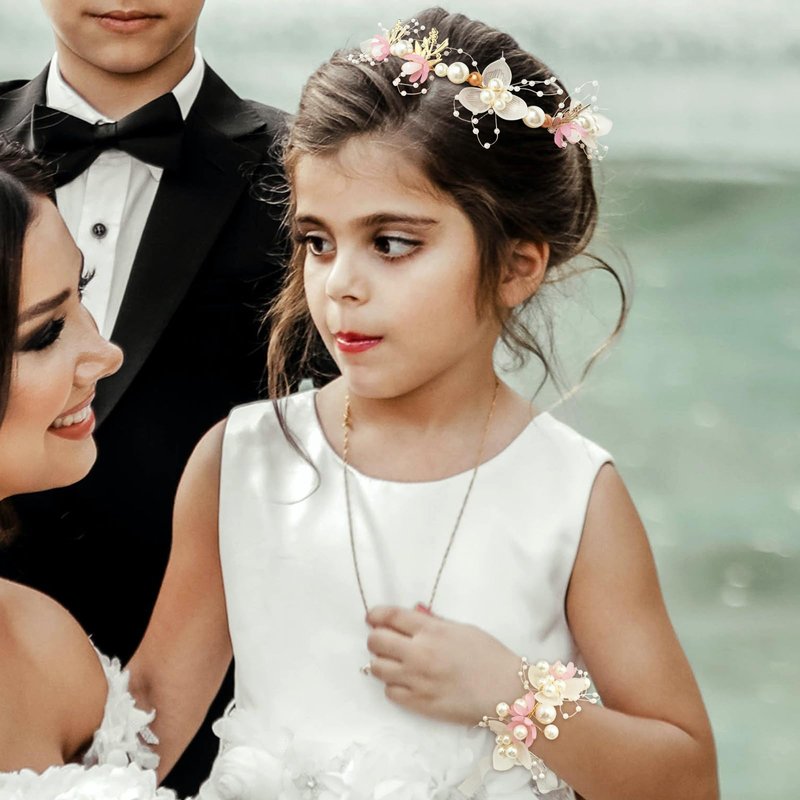 - 【Material】 Flower girl headpiece & wrist corsage set is made of quality alloy, faux pearls, resin beads & flower, delicate and easy to wear. (Note: with easy package, if there is any problem about the hair pieces you purchased, please feel free to contact us.)